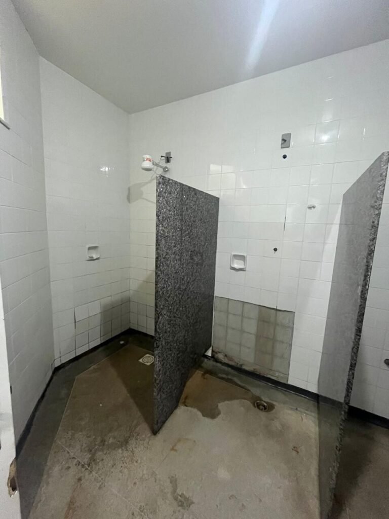 O revestimento das paredes dos banheiros também estava se soltando e caindo em vários pontos, oferecendo risco de acidentes a pacientes, familiares e funcionários. Na reforma, todas as portas foram substituídas, e o piso recebeu aplicação de resina, eliminando imperfeições que favoreciam o acúmulo de resíduos, bactérias e contaminação. Além disso, os banheiros ganharam barras de segurança e cadeiras de banho fixas, atendendo aos requisitos necessários para garantir a segurança dos pacientes.