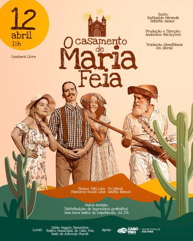 O Salão Angelo Samerson, localizado no Teatro Municipal de Cabo Frio Inah de Azevedo Mureb, recebe neste sábado (12) o espetáculo O Casamento de Maria Feia, em sessão única, a partir das 18h, com tradução simultânea em Libras.