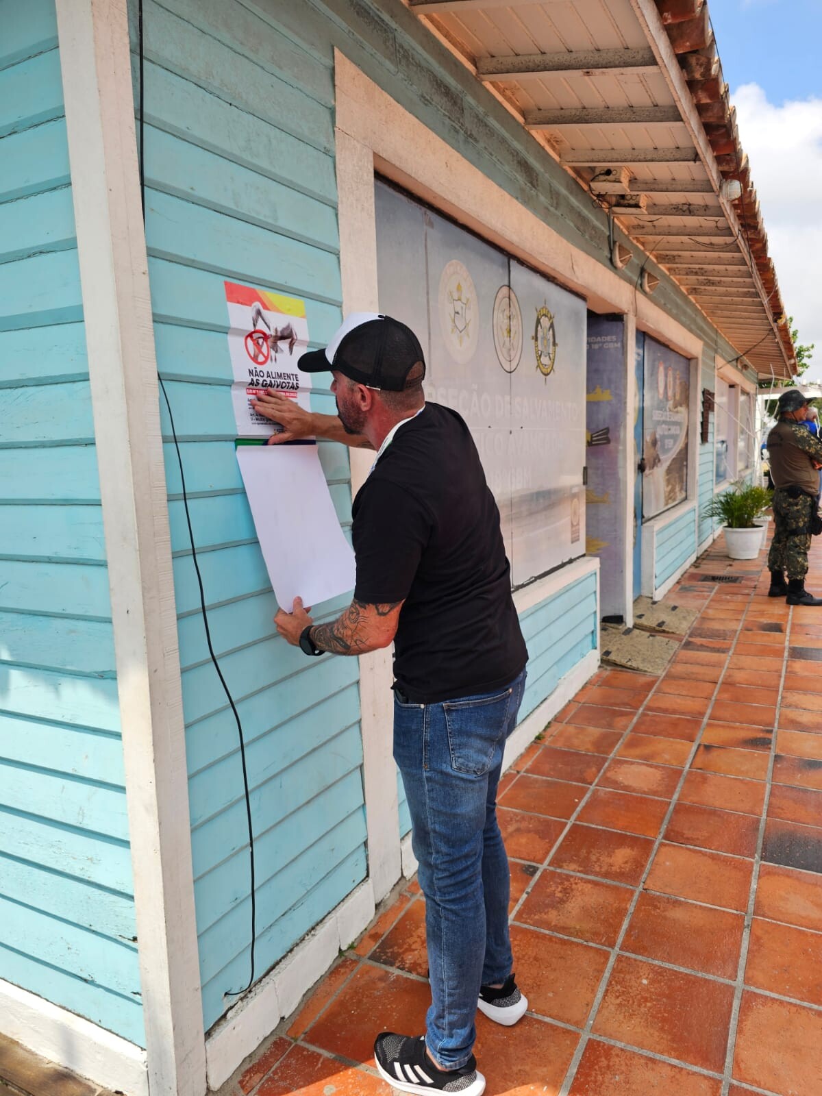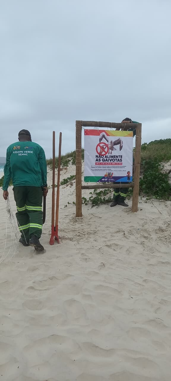 Nesta semana, a equipe da Secretaria realizou a instalação de lonas de grande porte com imagens e orientações sobre as gaivotas na Praia do Forte, reforçando a comunicação visual em um dos principais cartões-postais da cidade. As sinalizações advertem sobre os riscos e a proibição de alimentar aves silvestres, conforme a Lei Federal nº 9.605/1998 (Lei de Crimes Ambientais).