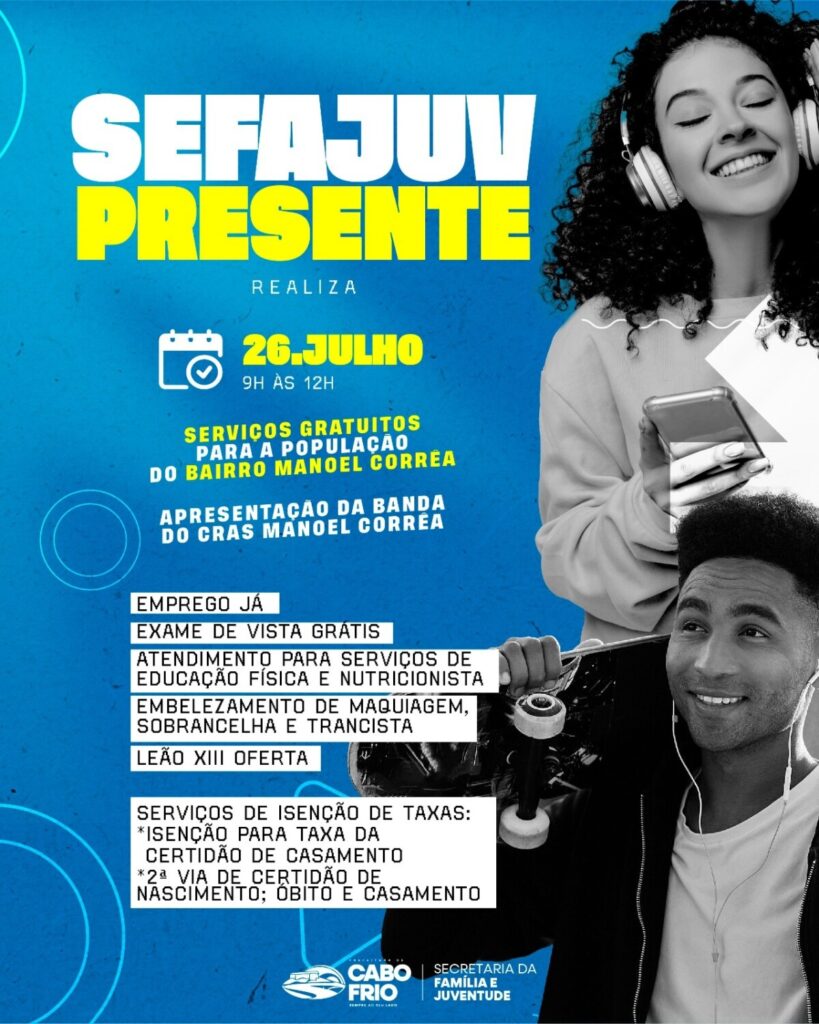 A Prefeitura de Cabo Frio, por meio da Secretaria da Família e Juventude, vai promover mais uma edição do “SEFAJUV PRESENTE. O evento será no sábado (26), das 9h às 12h, na Praça Padrio Viana de Freitas, no bairro Manoel Corrêa. A ação tem o objetivo de aproximar os serviços públicos da comunidade, promovendo cidadania.